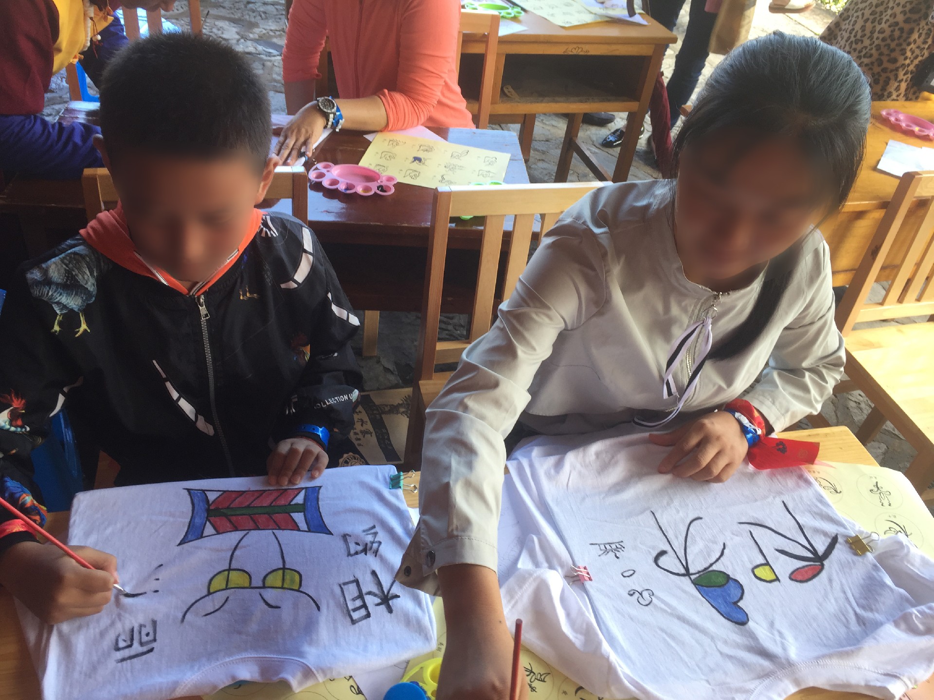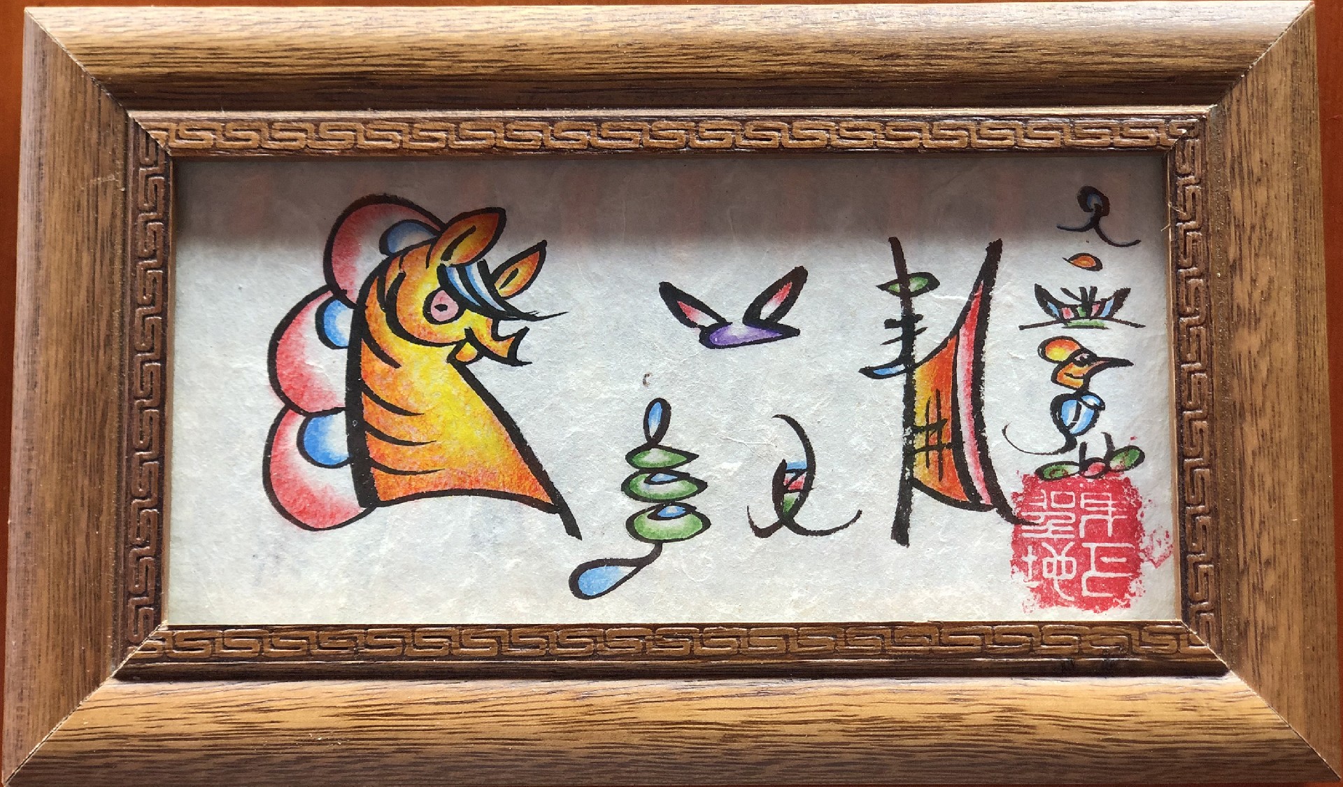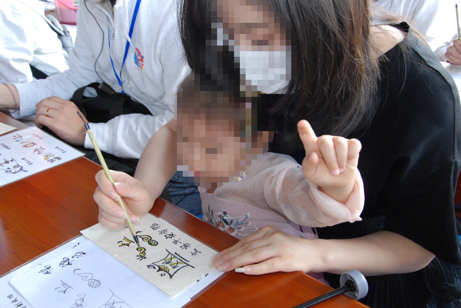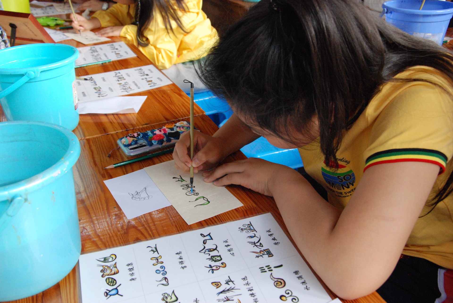 东巴大师现场教授简单的东巴文字书写,然后客人挑选喜欢的东巴文字自己完成作品。