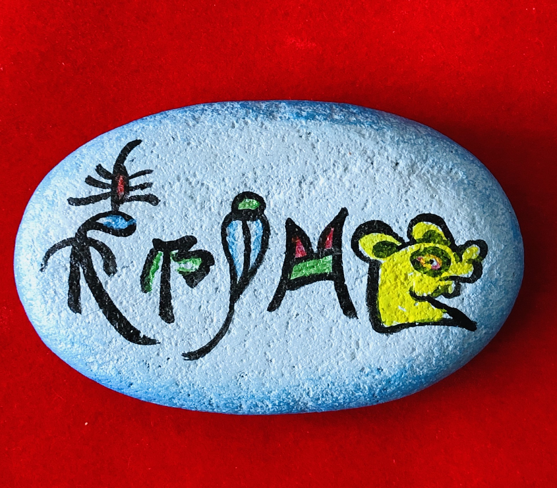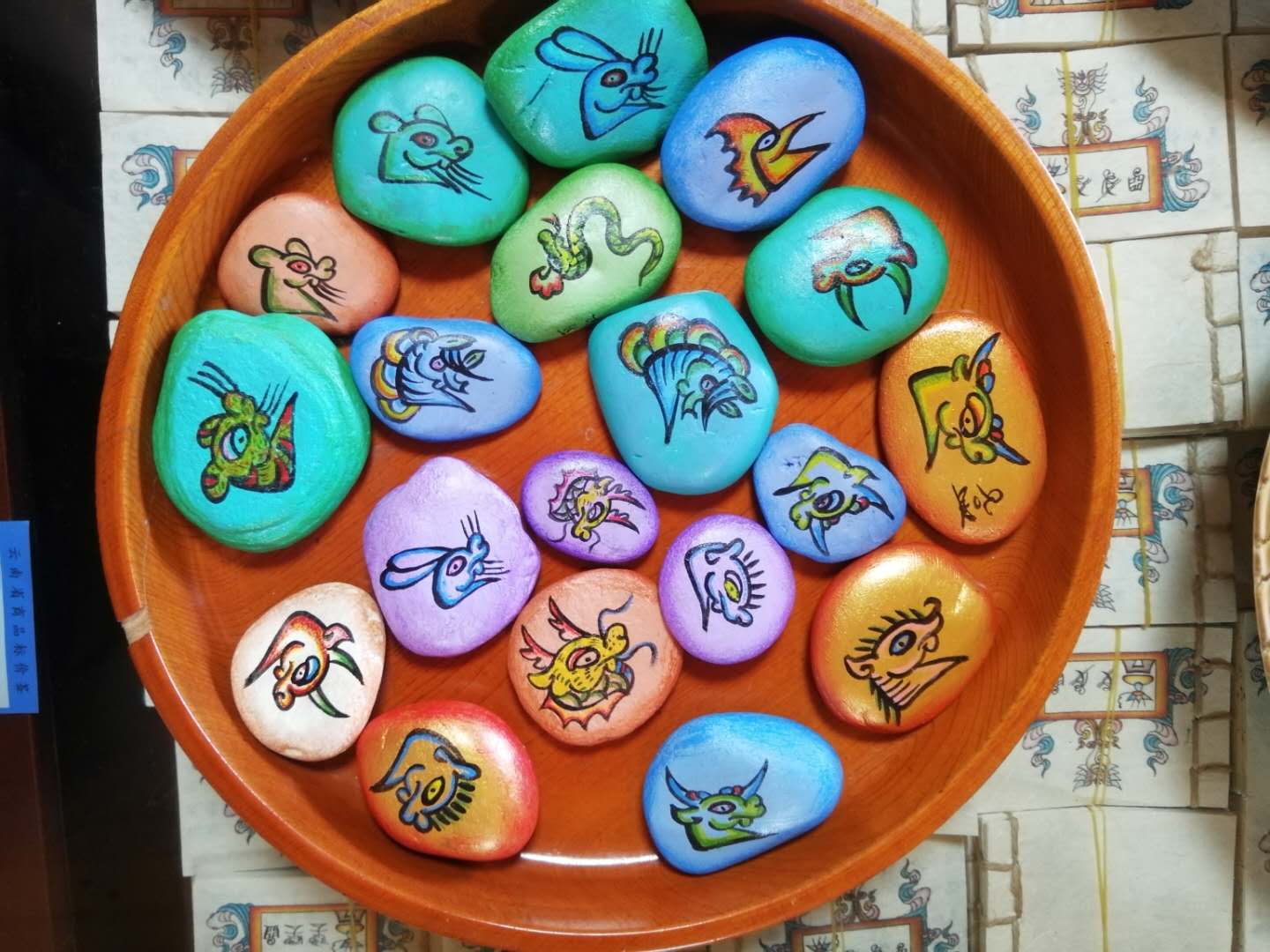 东巴大师现场教授简单的东巴文字书写,然后客人挑选喜欢的东巴文字和石头自己完成作品。