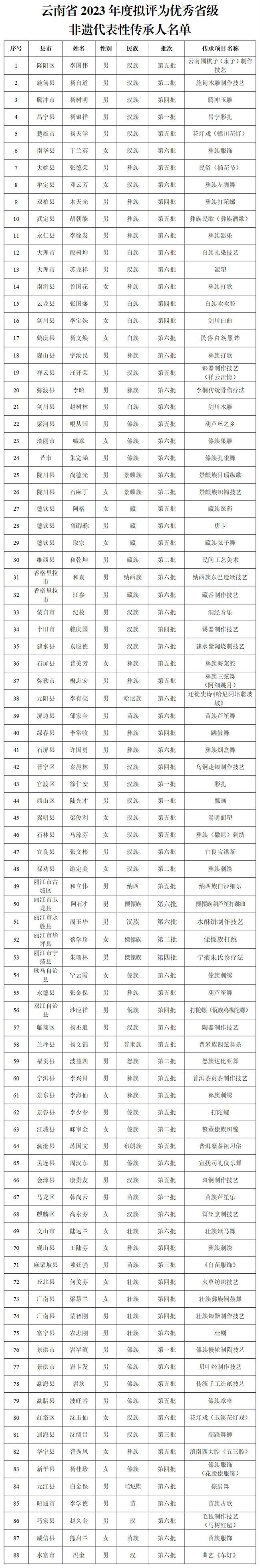 根据《云南省非物质文化遗产保护专项资金管理办法》,按照《云南省文化和旅游厅办公室关于开展2023年度省级非物质文化遗产代表性传承人传承活动评估工作的通知》要求,经实地评估、调查核实、专家评审等程序,从全省在世省级传承人中遴选产生88名拟评为2023年度优秀传承人。现将名单予以公示。